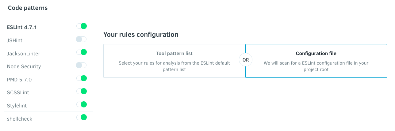 Codacy currently supports configuration files for several tools. To have results accordingly to your configuration file, you need to go to the Code Patterns view and select "Configuration file" for the respective tool and select the option as shown in the example below.