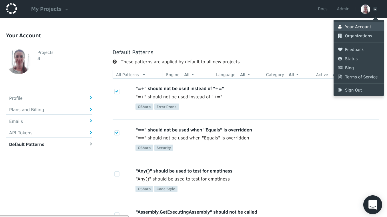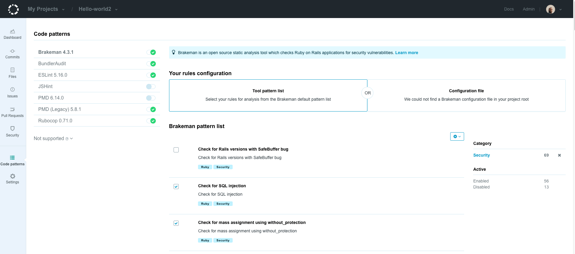 Here you can specify the patterns you want to use for each repository. When you change your account patterns it doesn't affect pattern selection for repositories already added. You can go to Code patterns: