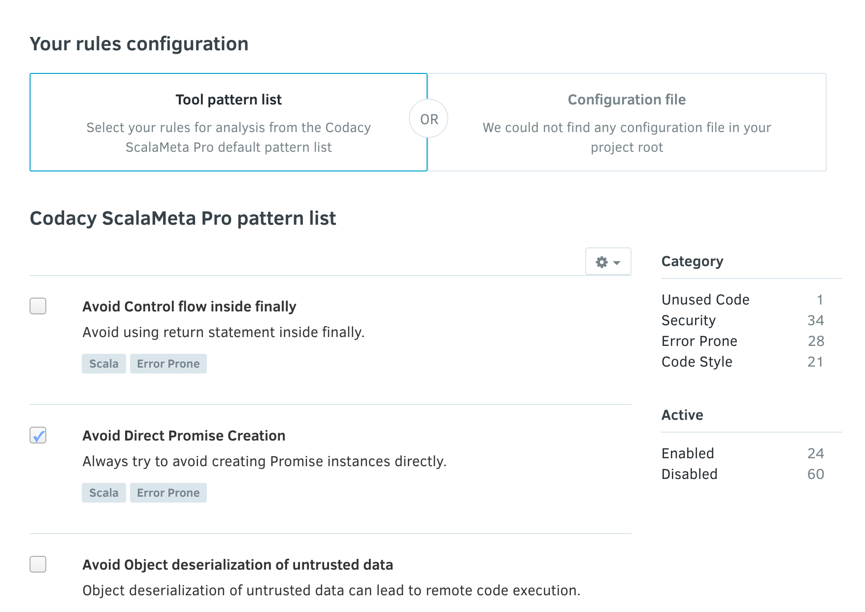 For performance reasons, if you make changes to pattern settings using configuration files, Codacy may display outdated messages for issues that have already been identified by those patterns.