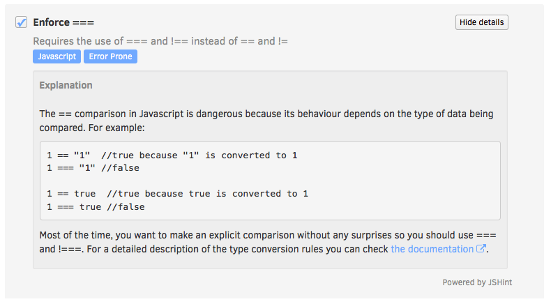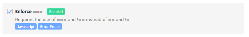 Error Prone - Code that may hide bugs and language keywords that should be used with caution. Ex: == in Javascript or Option.get in Scala
