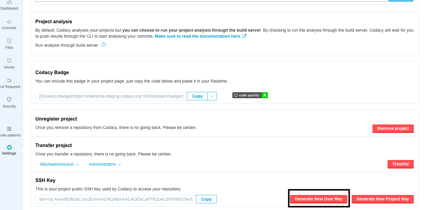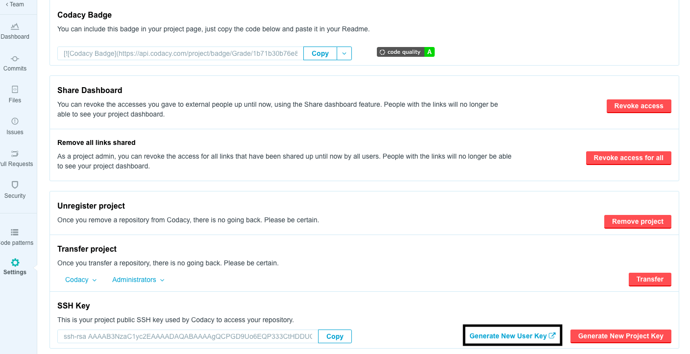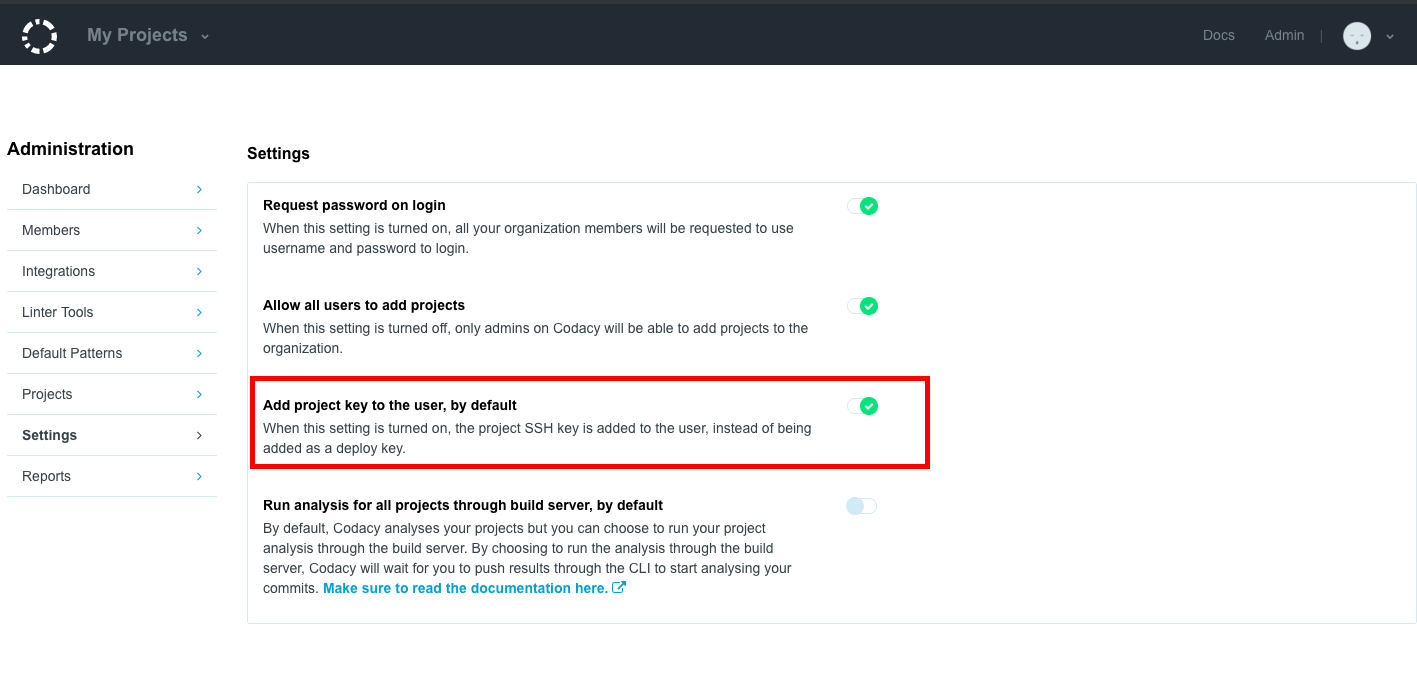 Don't forget to repeat these steps every time you add new repositories containing submodules to Codacy. Alternatively, you can make this the default behavior for all new repositories by turning on 'Add repository key to the user' in the Administration Settings. If you're using Bitbucket Cloud, since automatically adding the user keys is not supported this setting must be disabled.