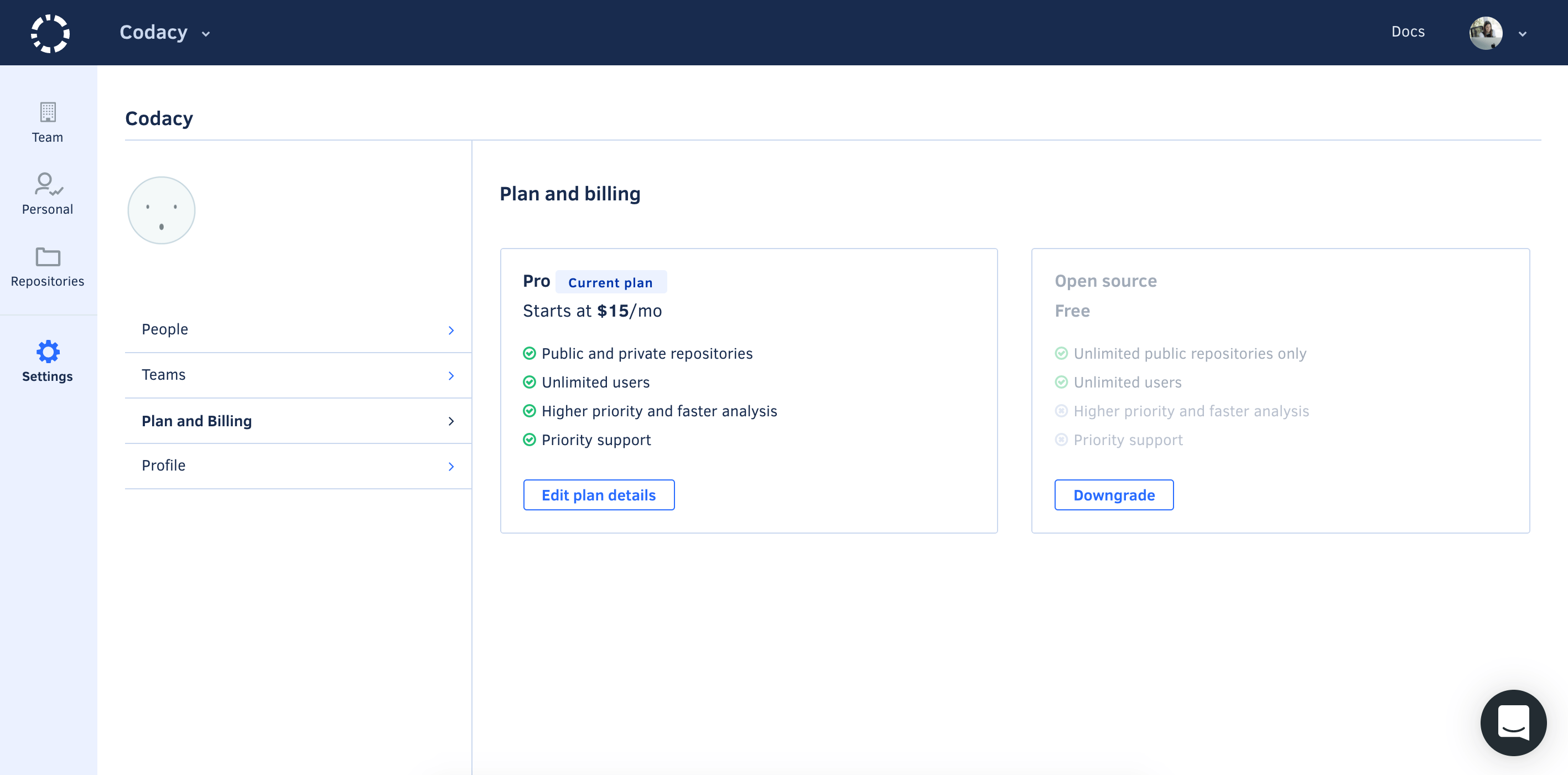 Sign up with your Git provider or Google account (no credit card required), and enjoy the full functionalities of Codacy for 14 days. After the trial period, you can either upgrade to a paid plan to enjoy Codacy with unlimited private repositories, or do nothing and stick with the free plan for open source repositories.
