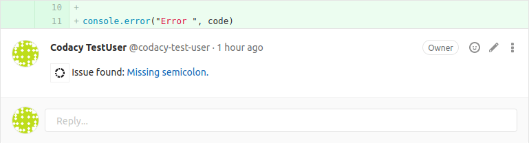 Pull Request Comment makes a comment on the Pull Request line when a new issue is found and shows the pattern raising the issue. Click on the issue link to go to Codacy to see more details about the issue and how to fix it.