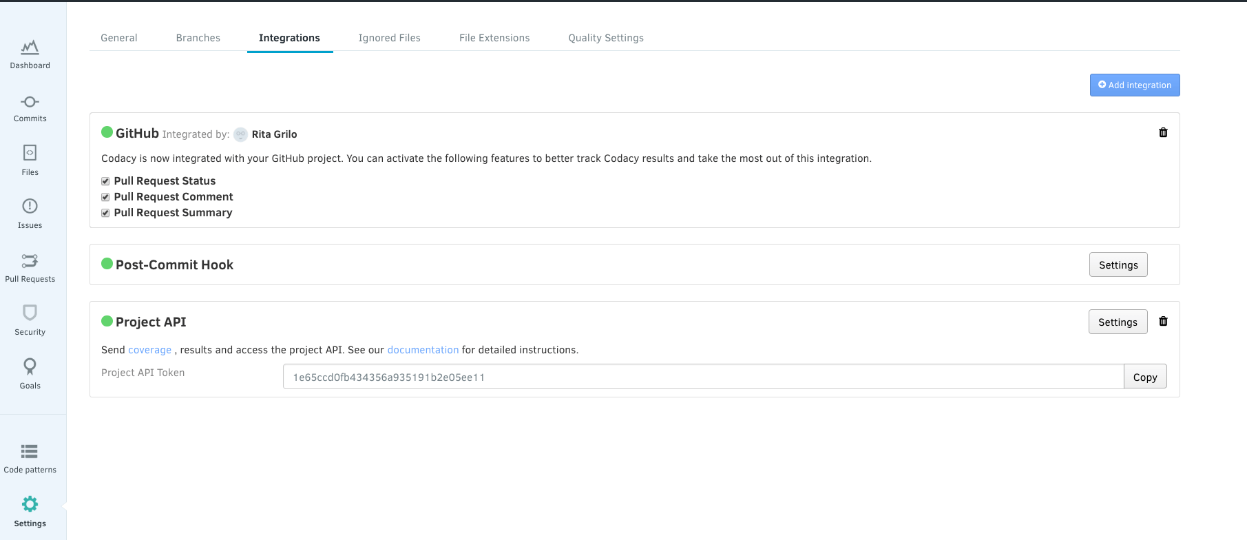 The Codacy API offers specific methods to manipulate repositories. You access these by using a Project API Token generated for your repository.