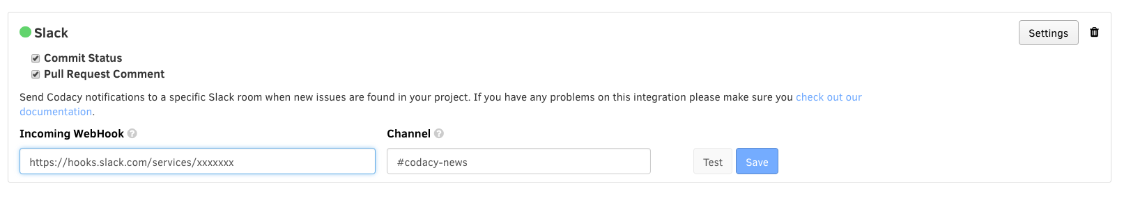 After adding a repository, you may want to enable Slack integration. Codacy integrates with Slack by sending messages to a channel when new issues are found.