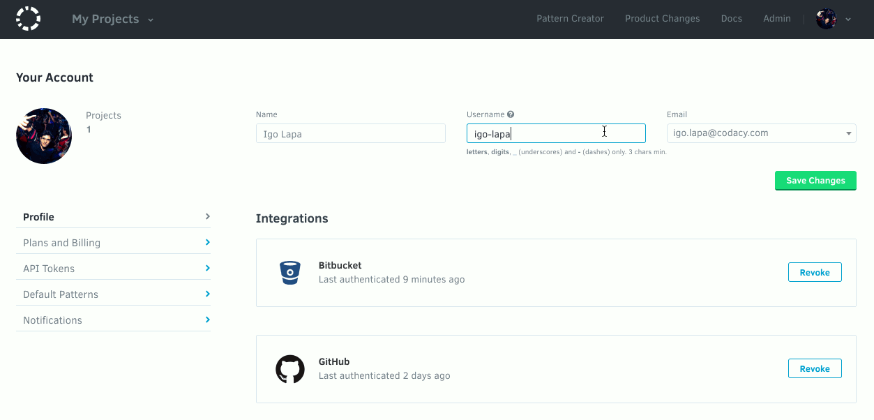 To change your avatar, create an account at http://www.gravatar.com/ using the same email address that you used to log into Codacy.