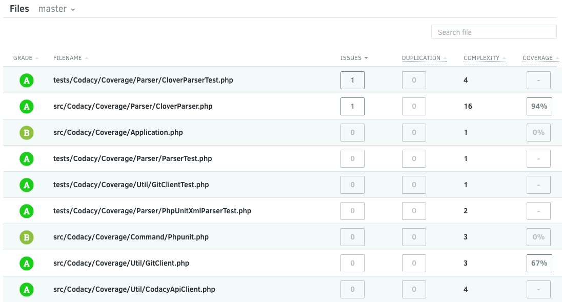 The file list shows all the files in your repository, sortable by six different columns: grade, filename, number of issues, code duplication, complexity, and code coverage. There is also a search filter available.