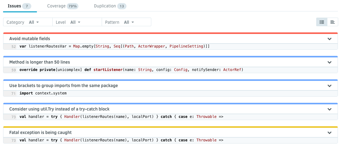 Below that header you will find a tab selector for further information on issues, coverage, and duplication. By default you will see the list of issues in the file. On the right-hand side you can toggle between a list view and the annotated source code.