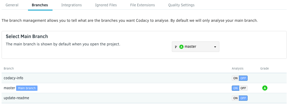 By default, Codacy will automatically trigger analysis on the master branch only.