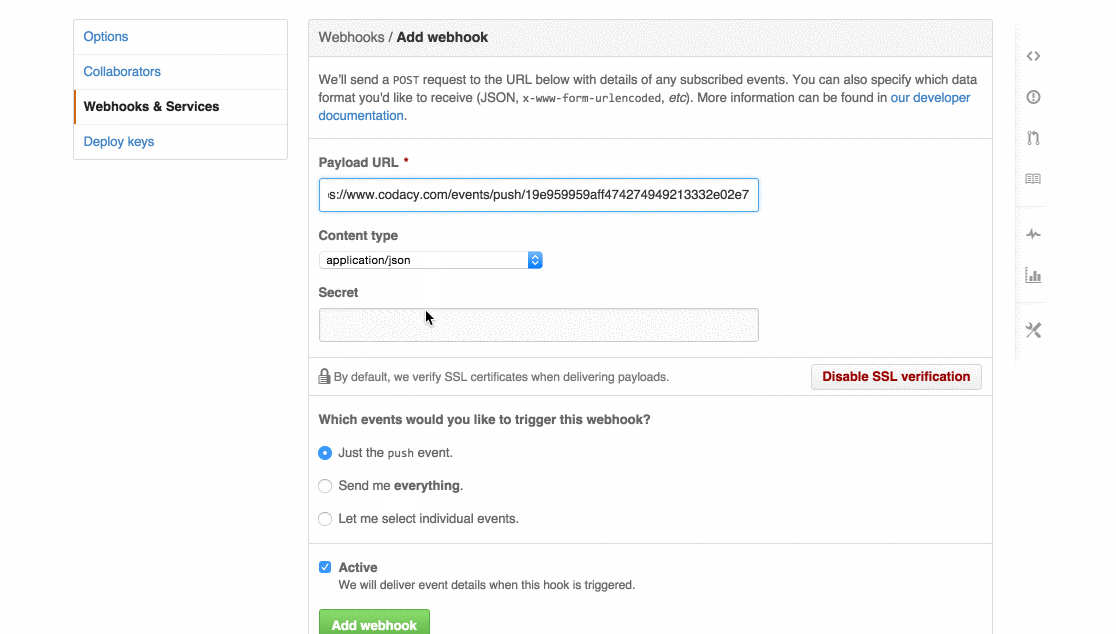 If you are using GitHub or Bitbucket you can let Codacy configure the hook for you. Just go to your repository settings and click on the Integrations tab. This should have a switch button for automatic setup of post-commit hooks.